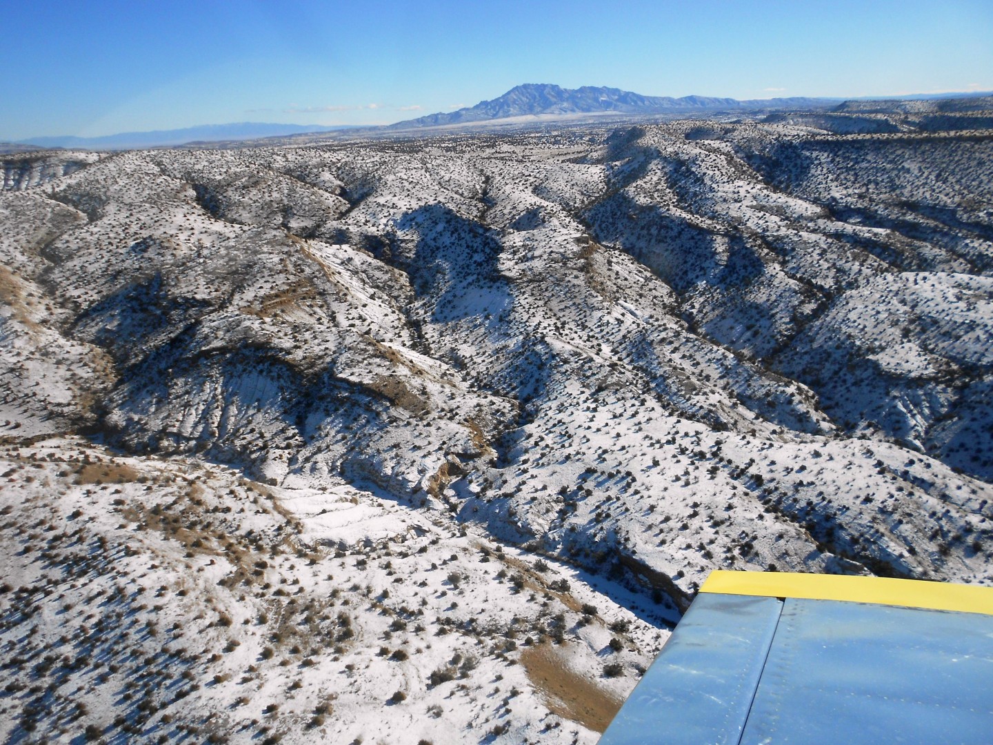 I flew west towards the Continental Divide and then south. The Bear and Magdalena Mountain ranges passed off my left wing as I slow cruised just enjoying the time and scenery. The Rio Grande river, I-25 Interstate, and most of the population runs along the east side of these two mountain ranges. The west side, where I was, is extremely sparse and beautiful. There was a dusting of snow which provided a nice contrast to the normal look of the area. The wind was definitely blowing as the bumps were pretty good near the peaks of the mountains but my little RV-3 doesn’t mind and just pokes right on thru them.