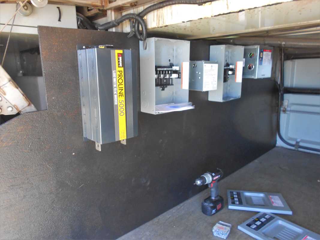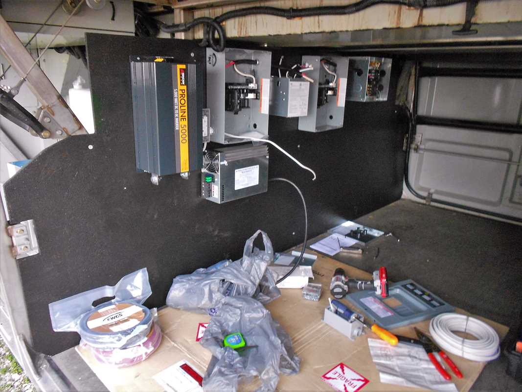 Left to right; 5000 watt inverter, primary circuit breaker panel, smart battery charger, 30 amp transfer switch (inverter or shore power – this is going to replaced with a 50 amp switch), secondary circuit breaker panel, 50 amp transfer switch (shore or generator).  Still have a number of components to install.