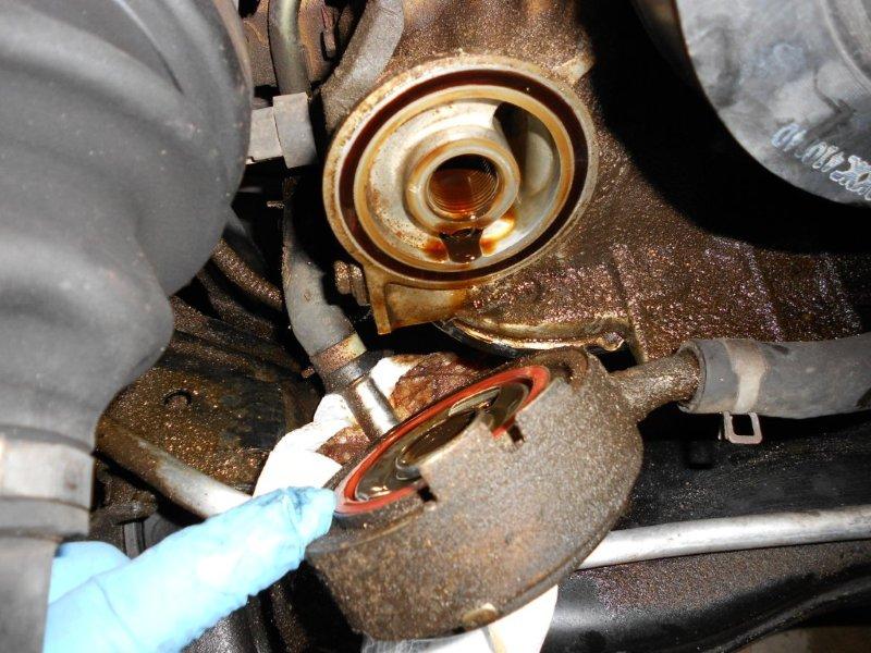 As you’ve probably learned about me, I enjoy the research as much as the task. So, of course, I started on the web. I discovered that many Murano owners have reported an oil leak at the oil cooler o-ring. This cooler is the component that is sandwiched between the oil filter and engine block. Engine coolant flows thru it. When the oil is hot, the cooler helps to cool the oil to coolant temperature – when the oil is cold, the “cooler” helps to warm the oil.
