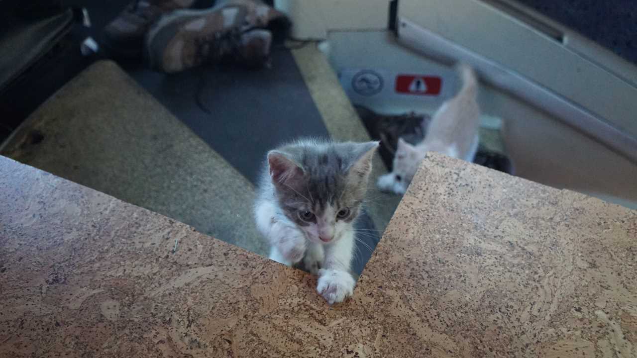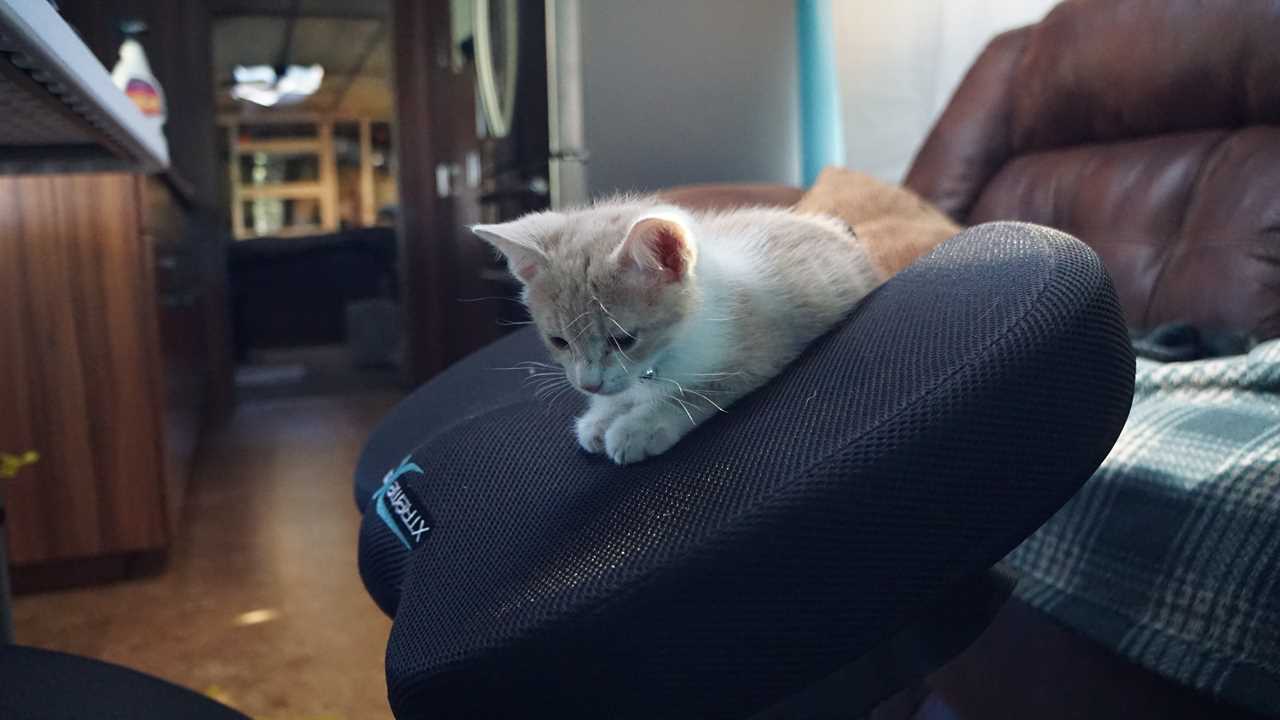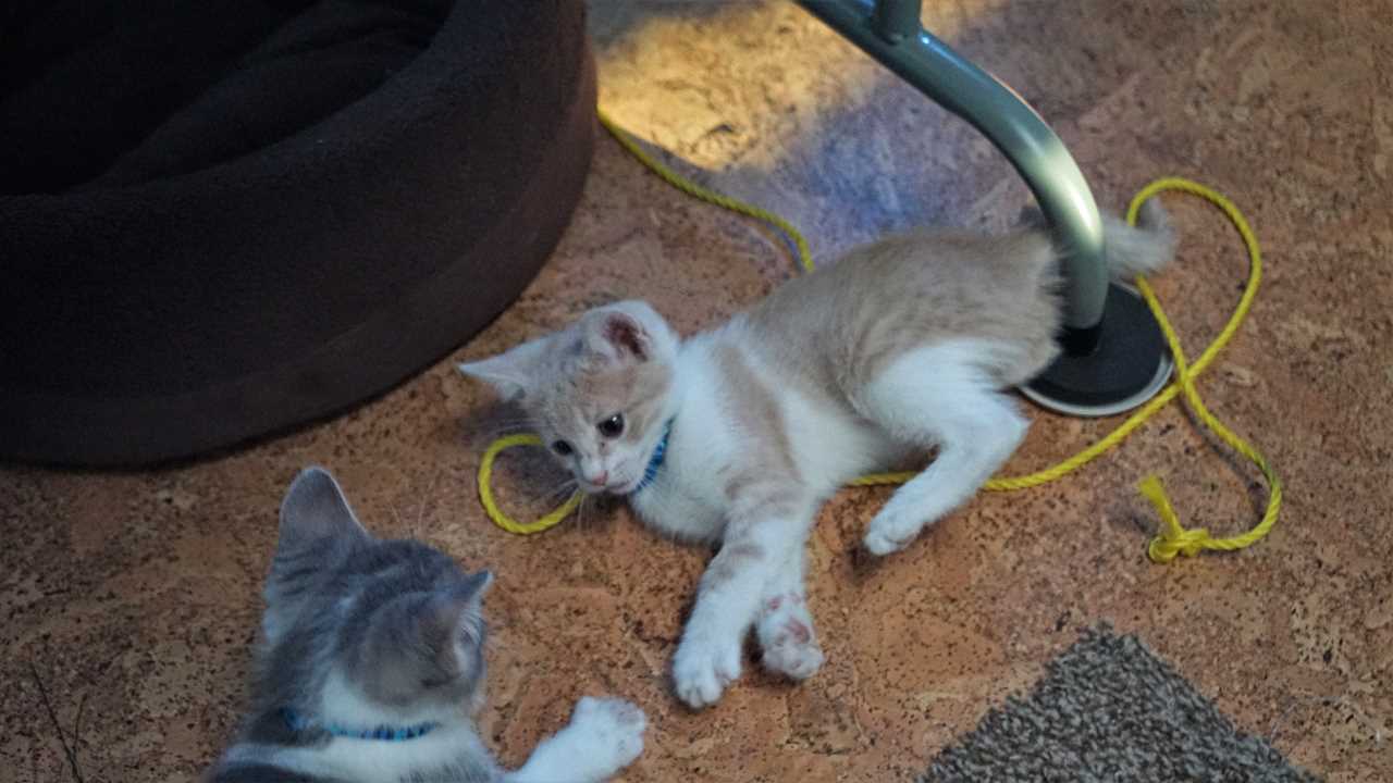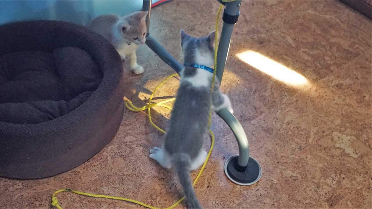 As of yesterday, the Woody weighed 1.8 lbs and Buzz was 2 lbs – they are seven weeks old. Obviously this weight doesn’t present much of a challenge for Missy. However; all of their belongs seem to be adding up, a couple beds, a climbing tree, a scratch post, food, bathroom facilities, etc…