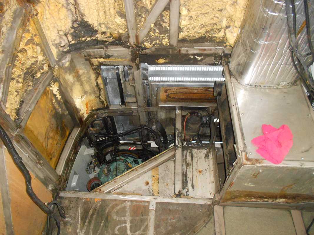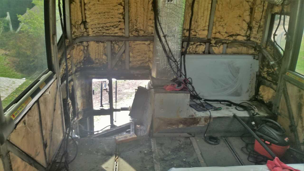 The old bus toilet/restroom/lavatory is out. Now I have a nice big hole in the floor just over the engine.