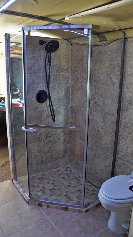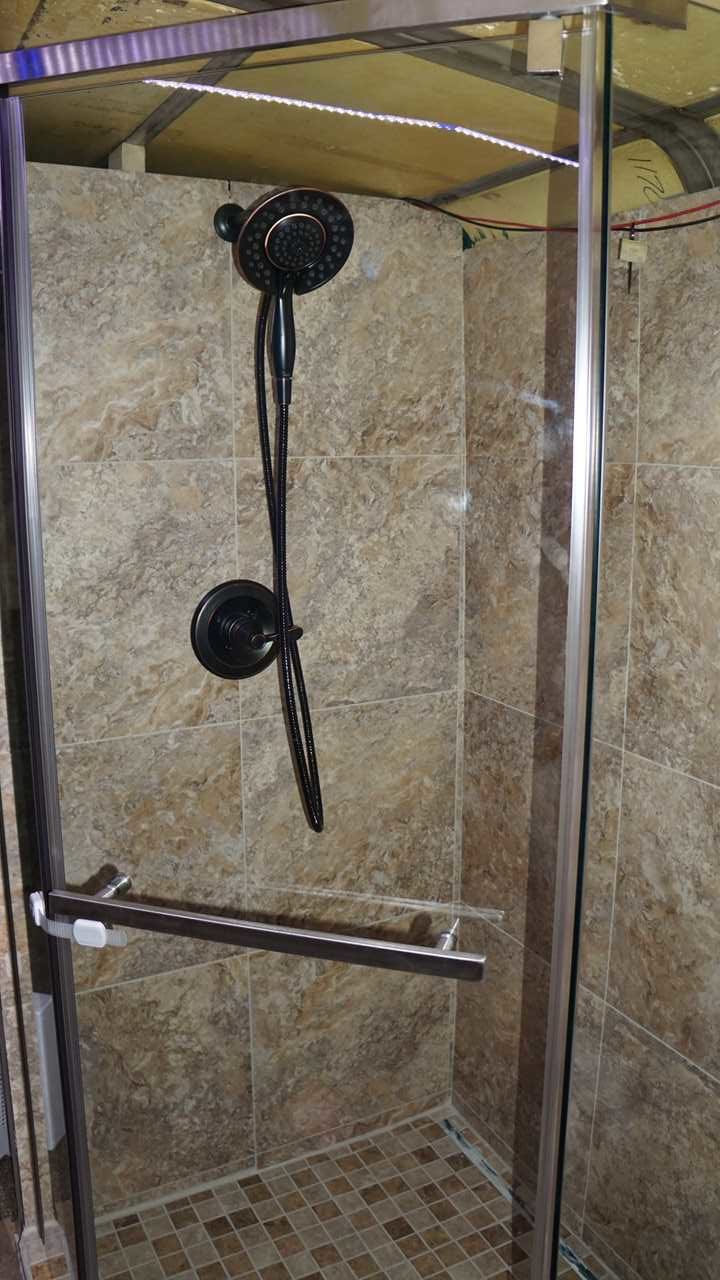 The water hookups were simple and now, when turning the shower handle on…. drum roll….. water squirts out!! I mean… it squirts out the shower head, where it is supposed to squirt from…